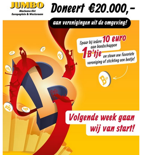 Bij elke €10 aan boodschappen bij de Jumbo in Elst (Europaplein en Basilica Westeraam) krijgt u een Btje (gele plastic munt) die u, in de beide winkels, in 1 van de kokers van de deelnemende vereniging kunt doen. Hoe meer muntjes wij verzamelen, hoe hoger het bedrag dat wij krijgen. Doet u boodschappen bij de Jumbo of kent u iemand die dat doet, dan hopen wij dat de Btjes in de koker met het logo van de Vereniging Veteranen Overbetuwe belanden, want ook voor ons geldt; Alle Beetjes helpen!