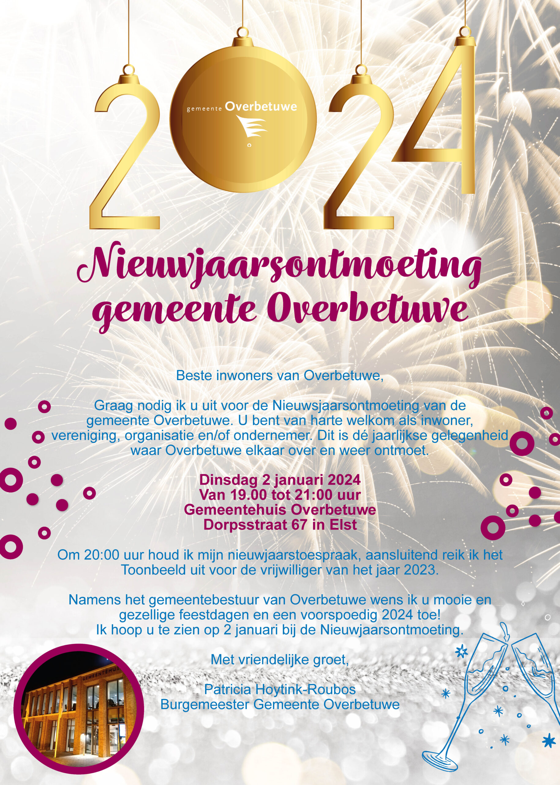 Gemeente Overbetuwe organiseert dinsdag 2 januari 2024 haar jaarlijkse Nieuwjaarsontmoeting in het gemeentehuis in Elst.