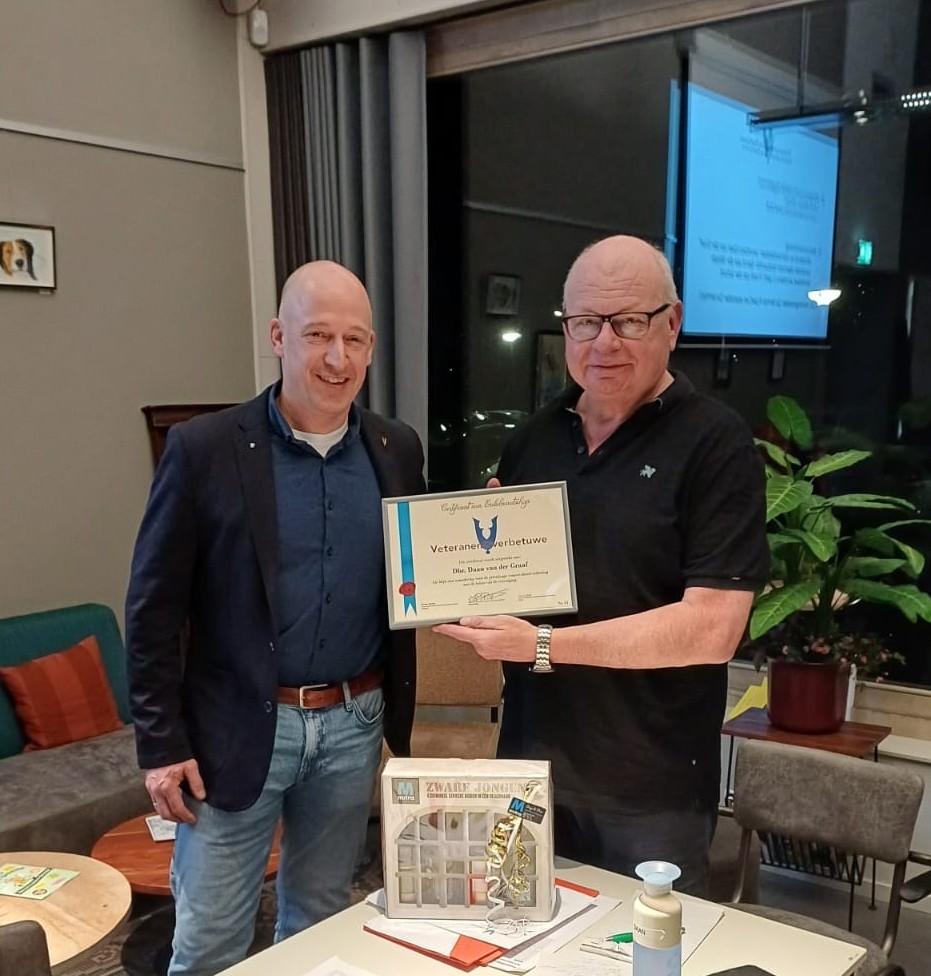 Het voorstel van het nieuwe bestuur om Daan te benoemen tot het eerste erelid van vereniging VeteranenOverbetuwe werd unaniem gesteund door de aanwezige leden bij de ALV.