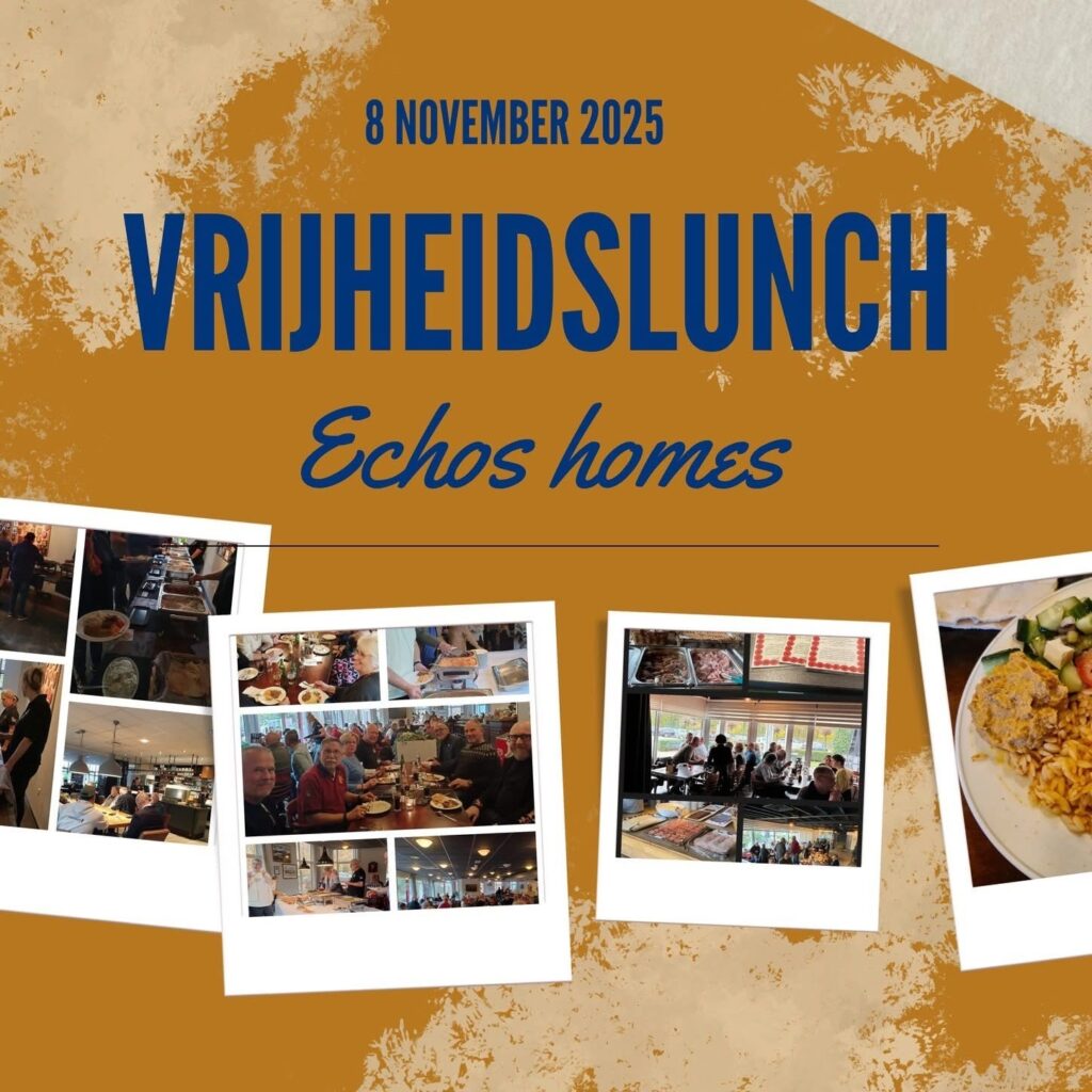 Net als vorig jaar worden alle veteranen en hun partners van harte uitgenodigd voor de Vrijheidslunch, die Stichting ECHOS homes samen met Stichting Hulp voor Helden organiseert. Op zaterdag 8 november bent u welkom in de ECHOS Vestingen in Ermelo, Havelte, Oirschot en Schaarsbergen. Inloop vanaf 11.30 uur, de lunch begint rond 12.00 uur.